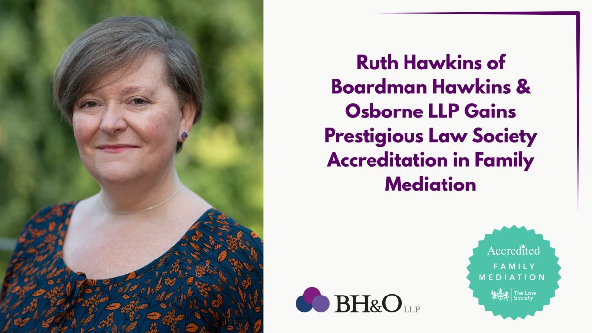 Boardman Hawkins & Osborne LLP (BH&O) is pleased to announce that Partner Ruth Hawkins has recently achieved Accreditation in Family Mediation from the Law Society – a recognition of her substantial expertise and experience in the field.
